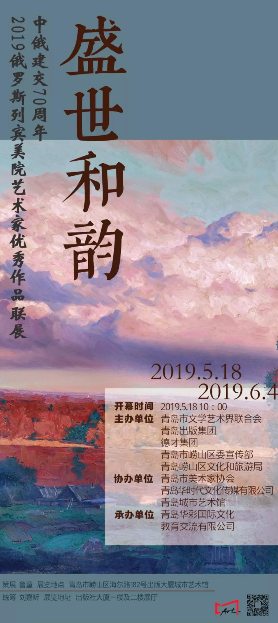 由青岛市文联、青岛出版集团、德才集团、青岛崂山区委宣传部、崂山区文化和旅游局主办,青岛美术家协会、华时代文化传媒有限公司协办,青岛华彩国际文化教育交流有限公司承办的“盛世和韵—中俄建交70周年,2019俄罗斯列宾美院艺术家优秀作品展”,将于2019年5月18日在青岛城市艺术馆开幕。